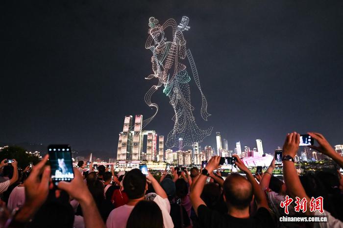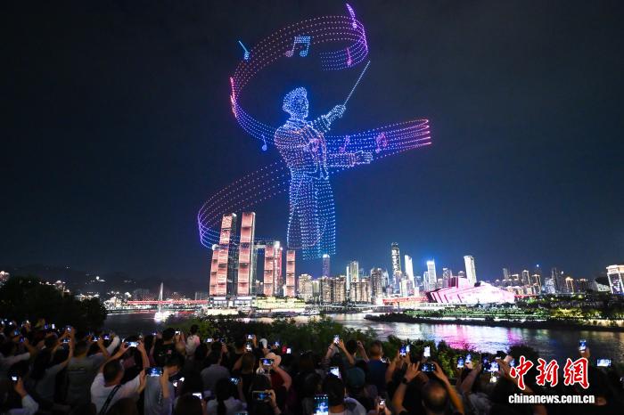 图为市民观看无人机灯光秀表演。中新社记者 何蓬磊 摄