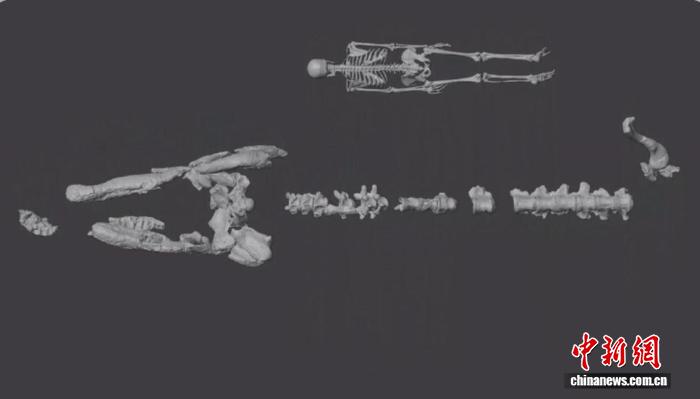 格兰德恐鳄(TMM43632-1)骨骼复原图。上方1.6米高人体骨骼(©Artec3D)以供比例参考。中国科学院古脊椎所 供图