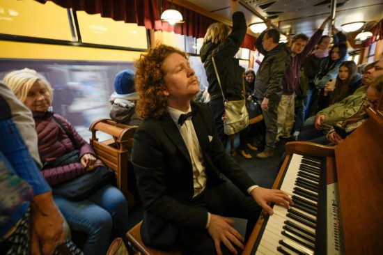 10月9日,在波兰华沙的“肖邦电车”上,一名钢琴家为乘客演奏肖邦作品。新华社发(亚普·阿林摄)