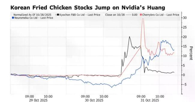 北京时间10月31日,英伟达CEO黄仁勋与三星电子会长李在镕、现代汽车执行会长郑义宣在韩国一家名为Kkanbu Chicken的炸鸡连锁店共饮啤酒。这次聚会的照片和视频在社交媒体上疯传,导致Kkanbu竞争对手Kyochon F&B的股价在周五一度飙升20%。韩国鸡肉产品加工企业Cherrybro公司股价也飙升30%,触及涨停板,成交量达到日均值的大约200倍。制造炸鸡机器人的Neuromeka公司股价同样飙升。