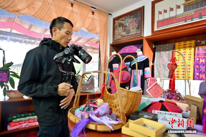 图为各类壮锦产品吸引参观者拍摄。俞靖 摄