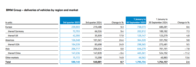 从销量来看,今年前九个月,宝马、MINI和劳斯莱斯品牌全球交付量接近180万辆(1795734辆),同比增长2.4%。2025年第三季度交付量达588140辆,同比稳健增长8.7%。前九个月,欧洲(+8.6%)和美洲(+9.8%)地区的增长势头尤为强劲,而中国市场是唯一下滑的市场。