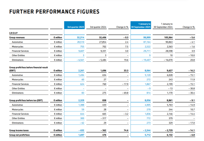 “我们并没有期望在2026年恢复增长。”沃尔特·默特尔也如此表示。而在营收和毛利率等关键指标上,也深受中国市场的影响。财报显示,2025年前九个月,宝马集团收入为999.99亿欧元,较上年同期轻微下滑(2024年:1059.64亿欧元,-5.6%;经汇率调整后:-3.9%)。宝马表示,收入变化的主要原因是汽车业务板块整体竞争激烈,以及为支持中国本地经销商体系所采取的措施。