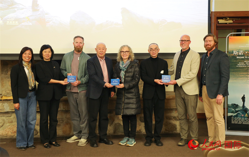 《斯诺·未竟之路》出品方与美国海伦·福斯特·斯诺基金会互赠礼品。人民网记者 李志伟摄