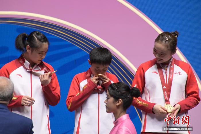 图为山东队选手范思琦(中)亲吻奖牌。中新网记者 陈永诺 摄