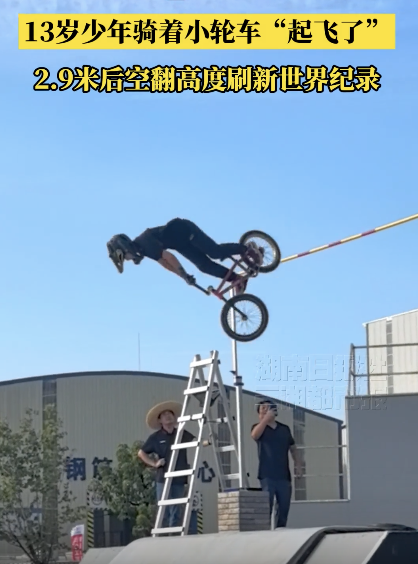 13岁少年骑着小轮车“起飞了” 挑战吉尼斯世界纪录。11月20日,吉尼斯世界记录日。近日,年仅13岁的深圳职业自由式小轮车(BMX)车手刘浩冉他以2.9米的后空翻高度,刷新“最高的小轮车后空翻”吉尼斯世界纪录,打破了由英国选手Ben Wallace自2010年以来保持的纪录。