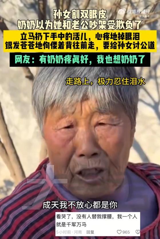 女子割双眼皮 奶奶以为被打心疼落泪 奶奶的爱让人泪目。“你的眼咋肿了?谁打你了?”河南一女孩割双眼皮后回家,奶奶以为她和老公吵架受欺负了,立马扔下手中的活儿,心疼地掉眼泪,银发苍苍地她佝偻着背往前走,要给孙女讨公道。网友:有奶奶疼真好,我也想奶奶了。