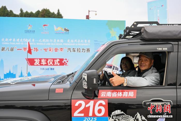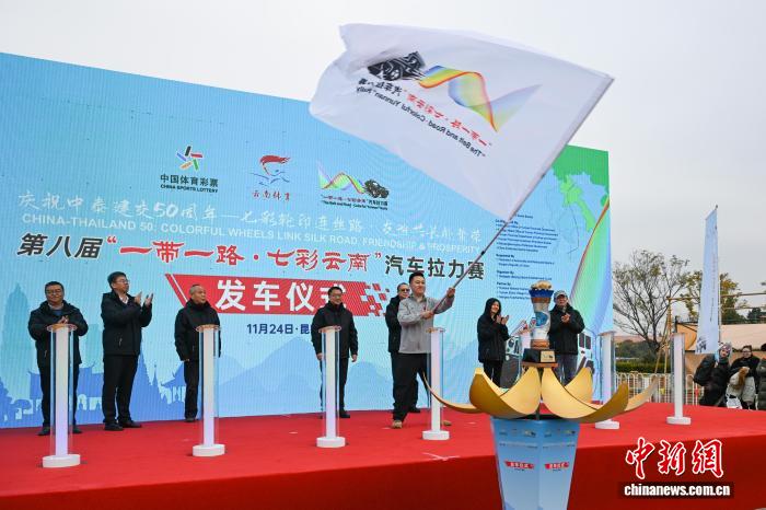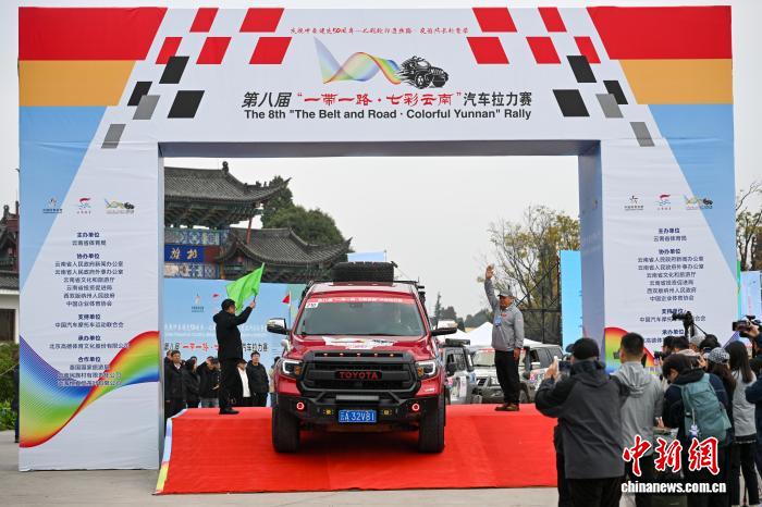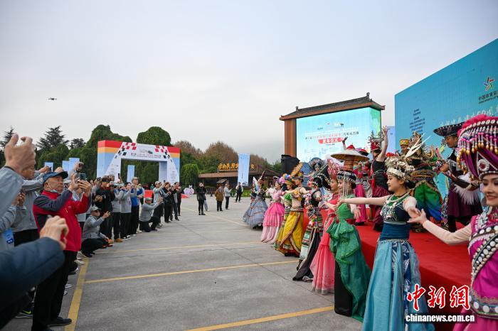 发车仪式上,“云南26个民族同唱一首歌”节目吸引车手。中新社记者 李嘉娴 摄