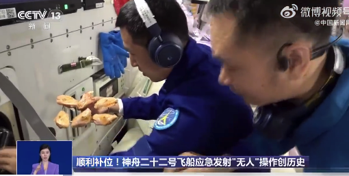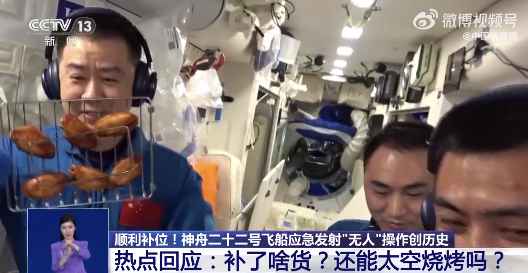 此次神舟二十二号飞船虽然没有载人,但是满载物资上行,有网友猜测,航天员们是不是能吃上大餐了呢?还真有!来自中国载人航天工程办公室的贺元军表示,本次神舟二十二号飞船装载了航天食品、航天药品、新鲜果蔬,特别是主食、副食、零食一应俱全,还紧急补货了饮料、调味品和保健品,口味方面兼具航天员的喜好,准备了川味和鲁味。大家关心的“太空烤箱”又能营业了,因为这一次还给航天员们送了鸡翅、牛排和蛋糕。网友:不争气的泪水从嘴角流了下来......