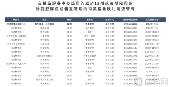 中国药品评审中心注册的Ⅲ期及后期阶段司美格鲁肽注射液 (肥胖症/体重管理适应症)管线清单