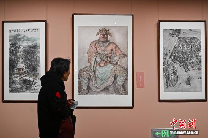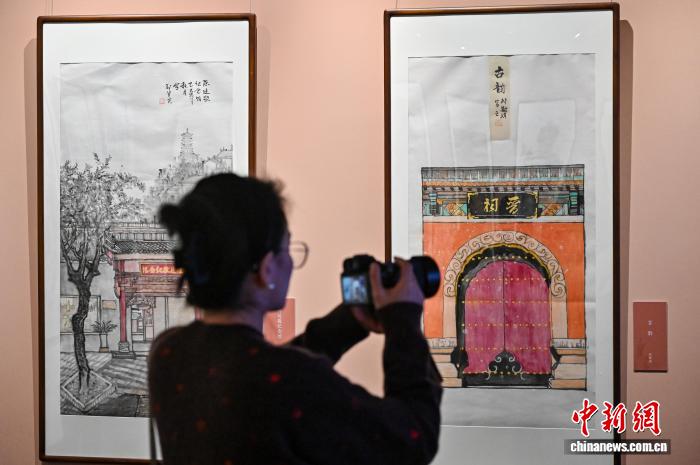 11月28日,山西省太原市,民众参观以山西古建筑、彩塑为主题的中国画作品。中新社记者 韦亮 摄