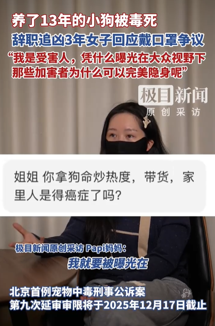 极目新闻原创采访Papi妈妈:凭什么因为我是受害人,我就要被曝光在大众的视野之下,任人评说犯罪嫌疑人,那些加害者永远都可以完美隐身,我即便再戴着口罩都会被攻击,懂吗?那我觉得我的口罩可能是我的最后的一道防线。