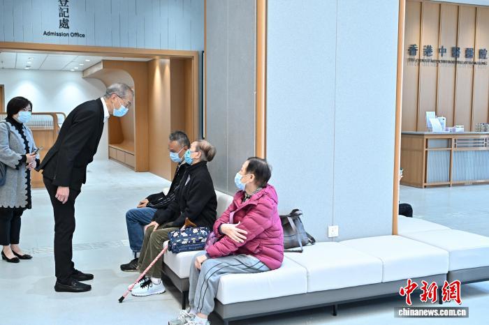 12月11日起,香港中医医院分阶段投入服务。图为当日医务卫生局局长卢宠茂(左二)在医院大堂与市民交谈,了解他们对香港中医医院服务的意见。特区政府新闻处供图