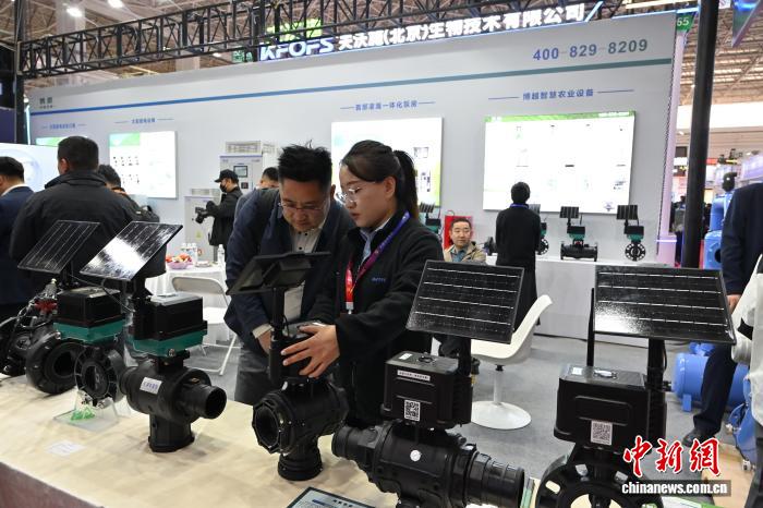 3月26日,内蒙古呼和浩特市,展商介绍太阳能阀门。中新社记者 刘文华摄