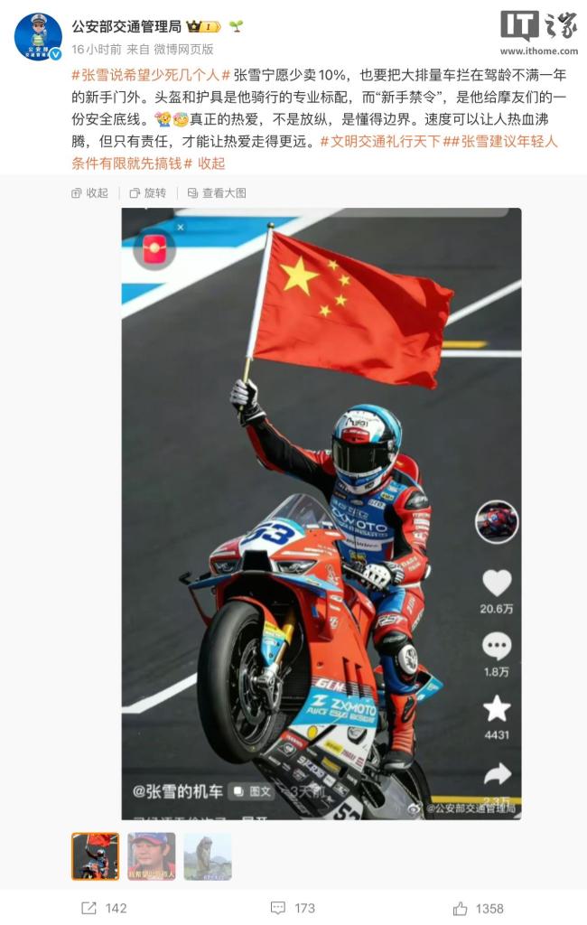 4月1日下午,公安部交通管理局官微发文支持张雪机车“禁止新手购买820RR摩托车”的举措。文中提到,张雪宁愿少卖10%,也要把大排量车拦在驾龄不满一年的新手门外。头盔和护具是骑行的专业标配,而“新手禁令”则是给摩友们的一份安全底线。真正的热爱不仅仅是放纵,更需要懂得边界。速度可以让人热血沸腾,但只有责任才能让热爱走得更远。